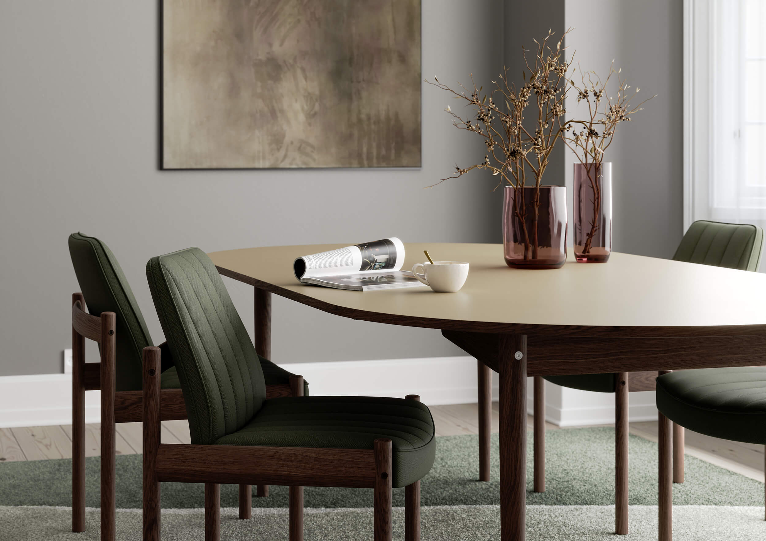 Oma is a dining table that has both a static version and an extendable version. The extendable version is designed to hold up to two leaves. There is no supporting leg needed for this solution. Oma is a part of a design series of dining tables designed in the mid-1950s, by Sigurd Resell. What characterizes Resell’s design is the defined logical construction where form follows function. The tabletop, which comes in solid wood or Fenix laminate, is perfectly balanced with its “sharp” form and modern aesthetics. The framework has a softer organic shape in solid wood, and as a complete product this translates into an instant classic. Designed in 1957