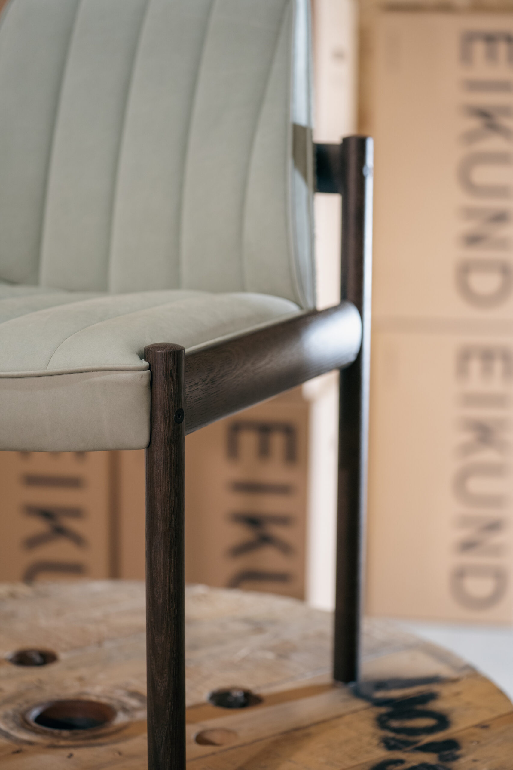 1 stykk: Røykelakkert eik uten armlene og med jadegrønt sete